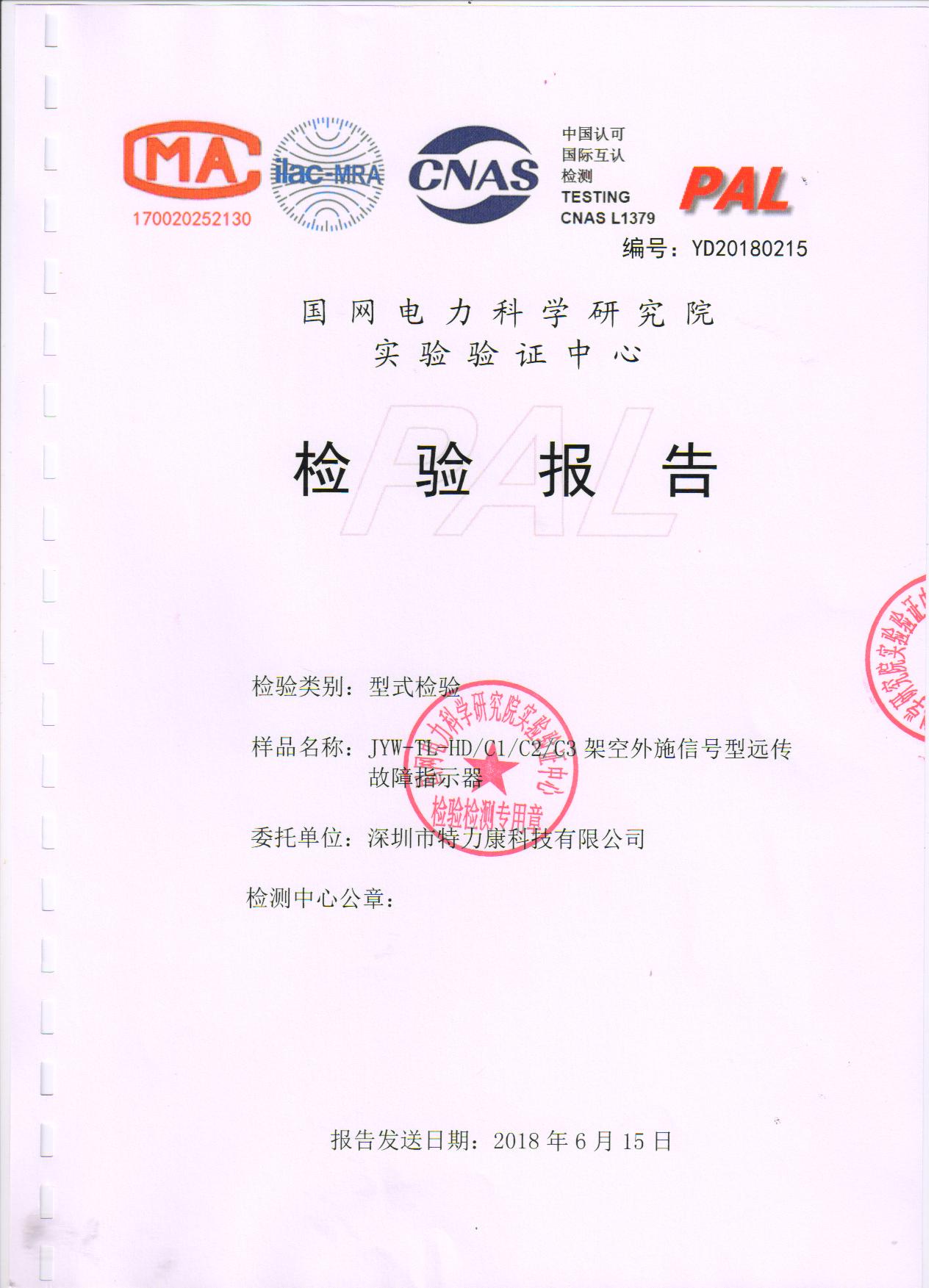 我司專注輸電線路在線監測十二年,在智能電網監測領域已有了不凡的地位。然而,為了更好的為電力智能化管理做出貢獻,我司大力組建研發團隊致力于配網故障監測產品開發,經多年研發與掛網測試,于2018年1月20日,經邀請,攜帶我司研發的架空暫態特征型、架空信號遠傳型故障指示器,前往國家電網電力科學研究院進行抽檢試驗及測試。在長達將近5個月的各項性能測試后,我司架空暫態特征型、架空信號遠傳型故障指示器的測試結果均達到合格。因此,于2018年6月15日國網電力科學研究院為我司發放了相關檢測報告證明文件(型式檢測報告)。