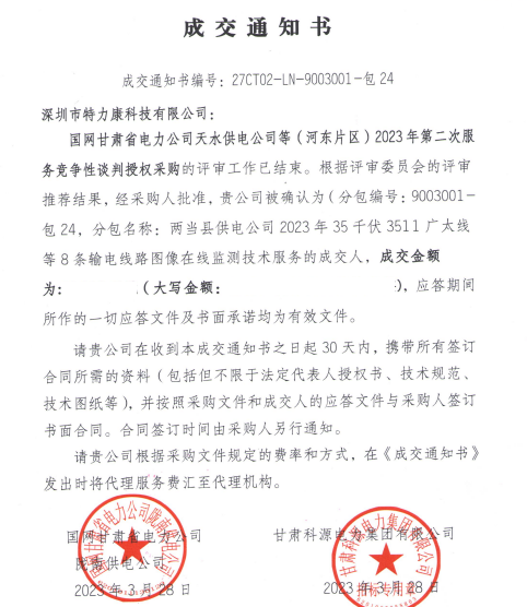國網(wǎng)甘肅省電力公司天水供電公司等(河?xùn)|片區(qū)) 2023年第二次服務(wù)競爭性談判授權(quán)采購的評(píng)審工作已結(jié)束。根據(jù)評(píng)審委員會(huì)的評(píng)審?fù)扑]結(jié)果,經(jīng)采購人批準(zhǔn),我司被確認(rèn)為(分包編號(hào): 9003001-包24,分包名稱:兩當(dāng)縣供電公司2023年35千伏3511廣太線等8條輸電線路圖像在線監(jiān)測技術(shù)服務(wù)的成交人,成交通知如下: