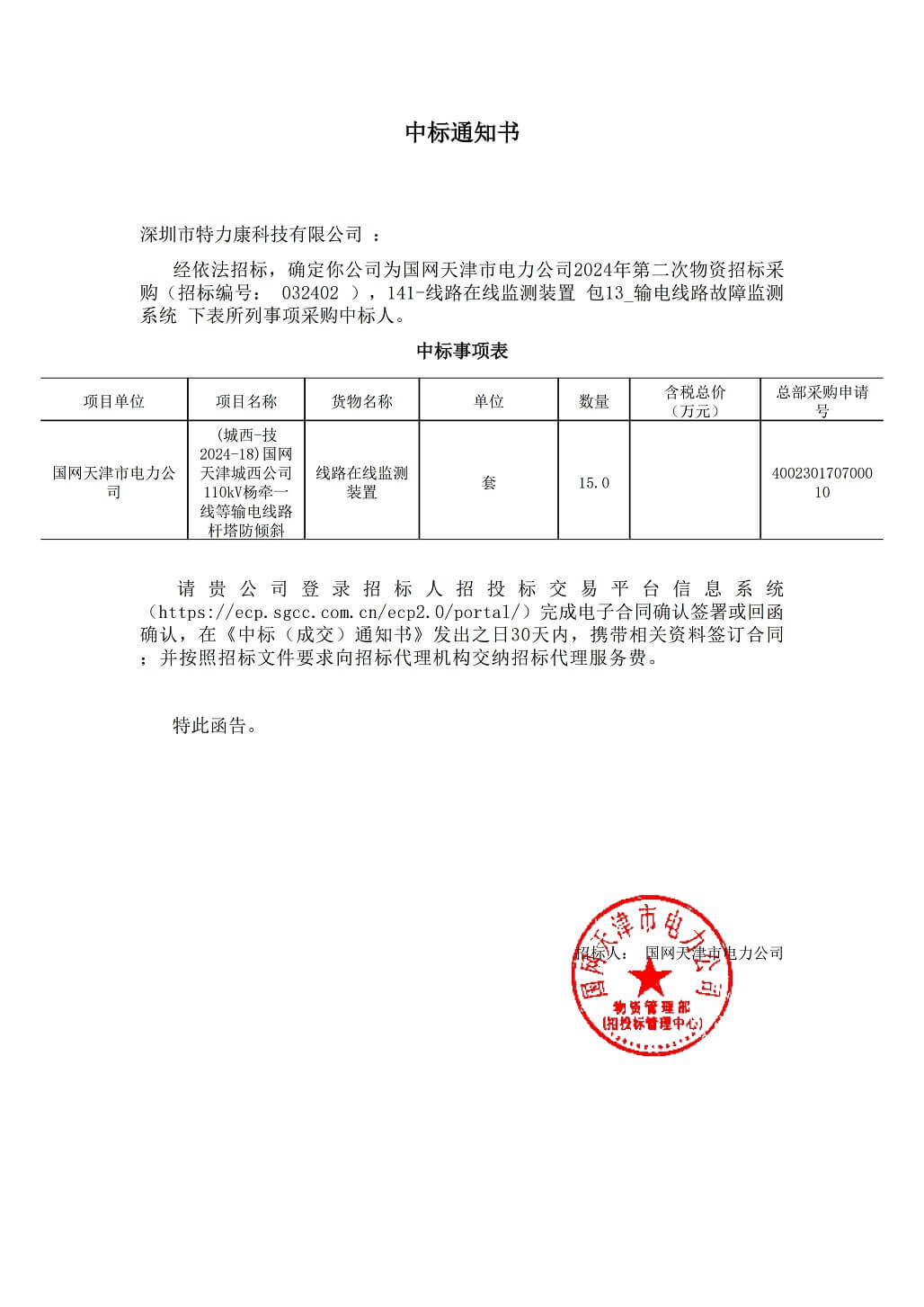 2024年4月18日——深圳市特力康科技有限公司(特力康)宣布,我司已中標(biāo)國網(wǎng)天津市電力公司2024年第二次物資招標(biāo)采購項目中的141-線路在線監(jiān)測裝置包13_輸電線路故障監(jiān)測系統(tǒng)。