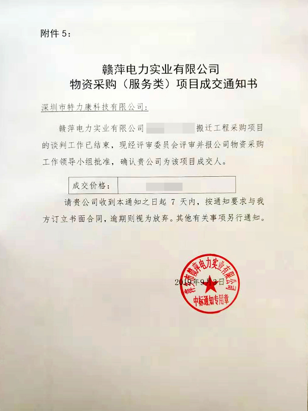 贛萍電力220KV線路搬遷工程采購項目談判工作已結束,經招標評審委員會評審,現確定我司以此次線路搬遷工程中標單位。