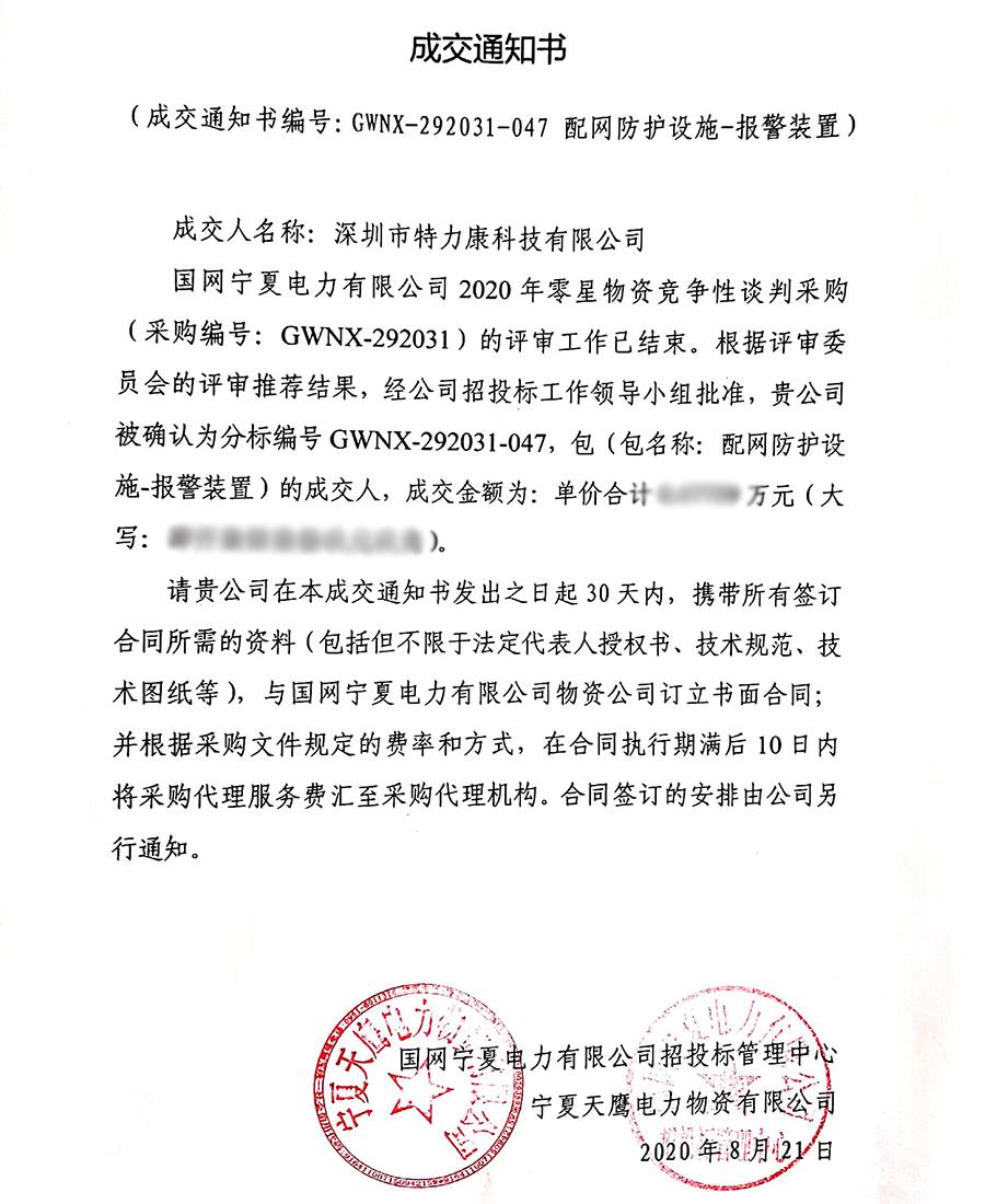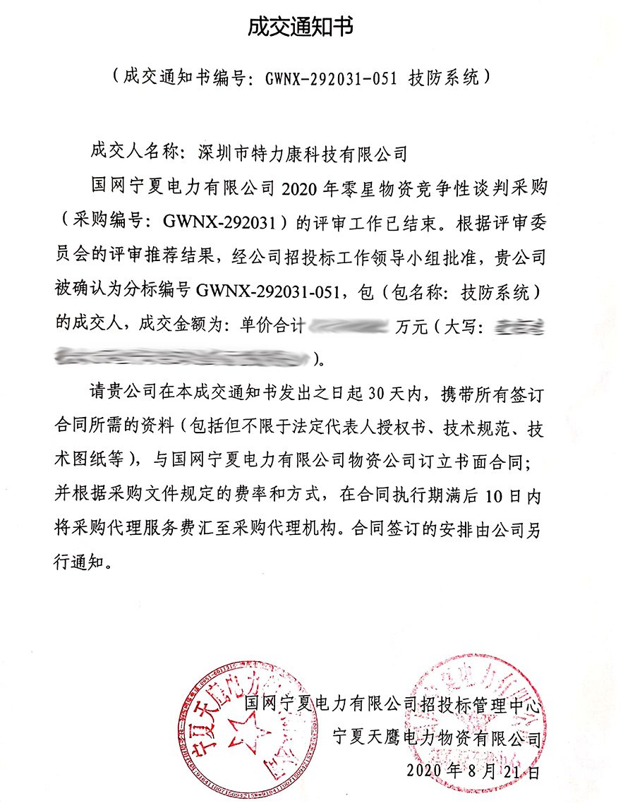 國(guó)網(wǎng)寧夏電力有限公司2020年零星物資競(jìng)爭(zhēng)性談判采購(gòu)(采購(gòu)編號(hào): GWNX-292031)的評(píng)審工作已結(jié)束。根據(jù)評(píng)審委員會(huì)的評(píng)審?fù)扑]結(jié)果,經(jīng)招投標(biāo)工作領(lǐng)導(dǎo)小組批準(zhǔn),我司(深圳市特力康科技有限公司)被確認(rèn)為分標(biāo)編號(hào)GWNX-292031-047,包(包名稱:配網(wǎng)防護(hù)設(shè)施-報(bào)警裝置)及分標(biāo)編號(hào)GWNX-292031-051,包(包名稱:技防系統(tǒng))的成交人,現(xiàn)發(fā)布成交通知書如下: