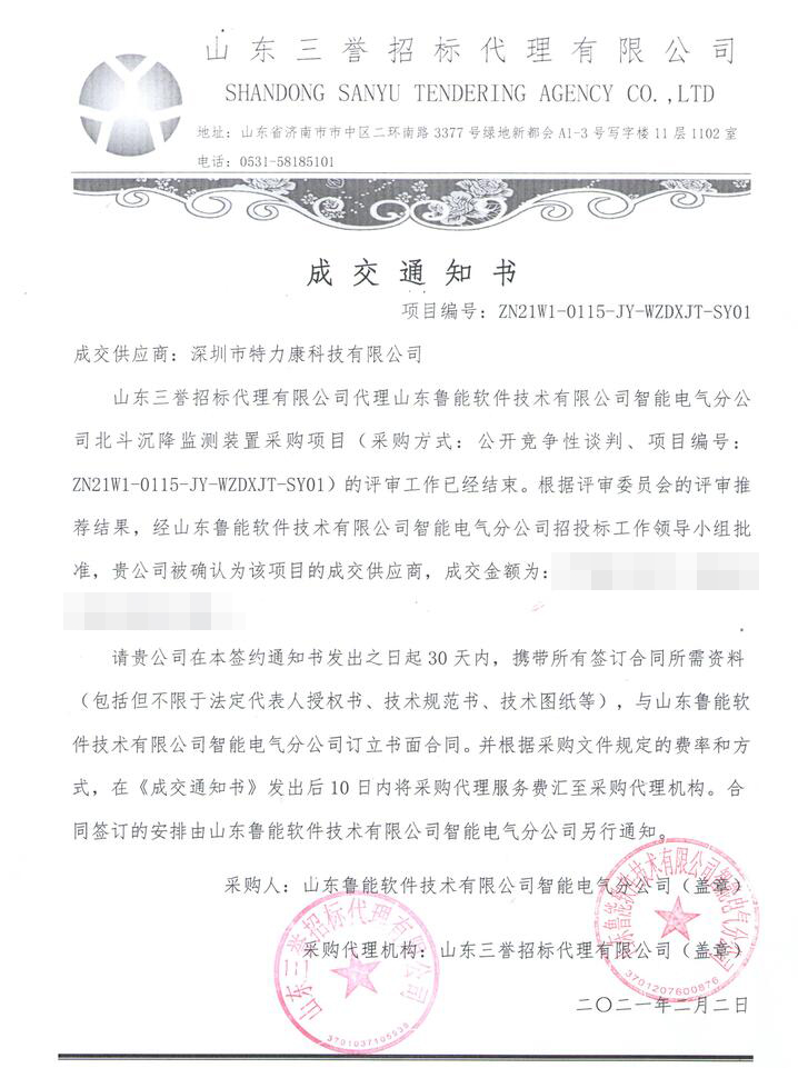 本次山東三譽招標代理有限公司代理山東魯能軟件技術有限公司智能電氣分公司北斗沉降監測裝置采購項目(采購方式:公開競爭性談判、項目編號:ZN21W1-0115-JY-WZDXJT-SY01)的評審工作已經結束。根據評審委員會的評審推薦結果,經山東魯能軟件技術有限公司智能電氣分公司招投標工作領導小組批準,我司(深圳市特力康科技有限公司)被確認為該項目的成交供應商,成交通知如下: