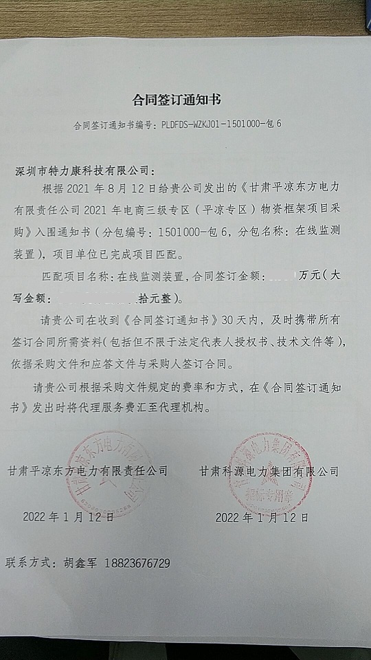 根據(jù)2021年8月12日給貴公司發(fā)出的《甘肅平?jīng)鰱|方電力有限責(zé)任公司2021年電商三級專區(qū)(平?jīng)鰧^(qū))物資框架項目采購》入圍通知書(分包編號: 1501000-包6, 分包名稱:在線監(jiān)測裝置,項目單位已完成項目匹配。成交通知如下: