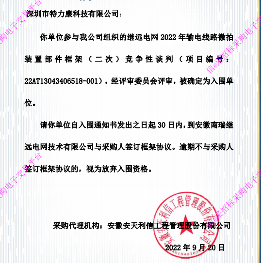 深圳市特力康科技有限公司:你單位參與我公司組織的繼遠電網2022年輸電線路微拍裝置部件框架(二次)競爭性談判(項目編號:22AT13043406518- 001) ,經評審委員會評審,被確定為入圍單位。中標通知如下: