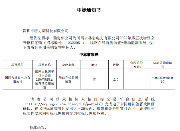 經(jīng)依法招標(biāo),確定我司(深圳特力康)為國網(wǎng)吉林省電力有限公司2022年第五次物資公開招標(biāo)采購(招標(biāo)編號: 232205 ),線路在線監(jiān)測裝置-舞動監(jiān)測系統(tǒng)包1下表所列事項采購貨物中標(biāo)人。中標(biāo)通知如下: